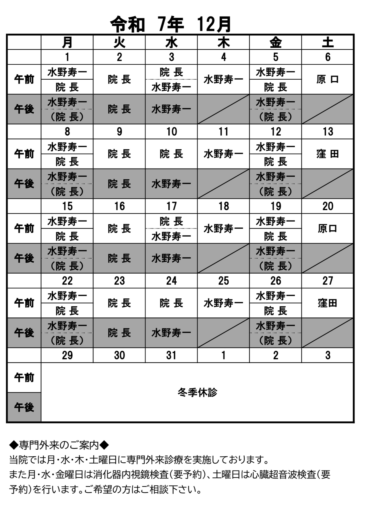 12月外来担当医のおしらせ