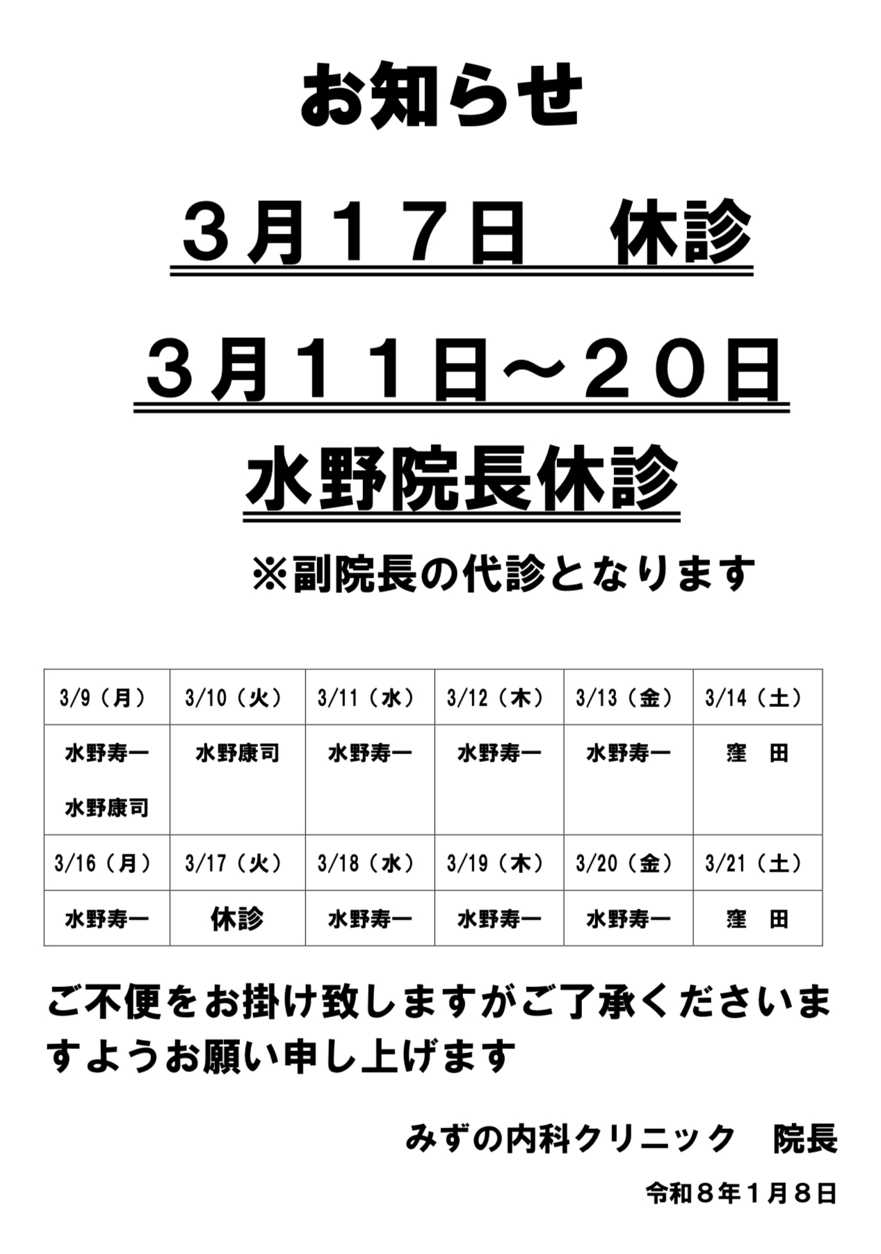 3月休診と代診のお知らせ